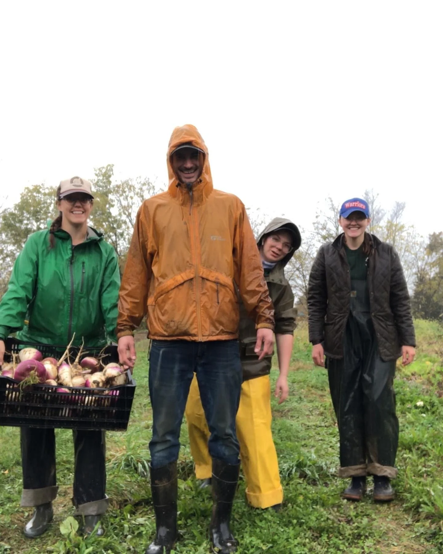 An incredibly damp day in the deluge that was fall 2023, but turnip harvest carried on in good spirits, even though poor Andrew forgot his rain gear.